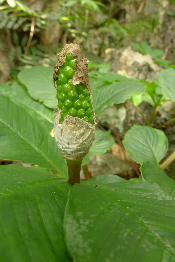 กวักนวลจันทร์ ไม้ล้มลุก สูงได้ถึง 0.8 ม. ผลัดใบ มีหัวใต้ดินรูปทรงกลม สีเหลือง อมน้ำตาล ใบประกอบแบบมี 3 ใบย่อย เรียงสลับ ก้านใบสีเขียวอมแดงถึงสีแดงอมม่วงเข้ม กาบช่อดอกโคนเชื่อมกันเป็นหลอดรูปทรงกระบอก สีขาวนวลถึงสีเหลืองอ่อน ปลายแผ่ออกรูปใบหอก ยาวมากกว่าหลอดกาบช่อดอก 3-4 เท่า สีเหลืองอ่อน ปลายสุดเรียวเป็นหางยาวได้ถึง 3 ซม. ช่อดอกแบบช่อเชิงลดมีกาบ ปลายมีรยางค๋ยื่นพ้นหลอดกาบช่อดอกชัดเจน ส่วนล่างเรียบเกลี้ยง สีขาวถึงสีแดงอมน้ำตาล ส่วนบนแยกเป็นอับเรณูติดกันที่เป็นหมันสีเหลืองอ่อนถึงสีแดงอมน้ำตาลจำนวนมาก บริเวณที่สืบพันธุ์ได้มีดอกเพศผู้หรือดอกเพศเมีย ดอกเพศผู้เรียงตัวหลวมๆ ส่วนดอกเพศเมียเรียงอัดกันแน่น รูปทรงกระบอก ผลอัดกันแน่น รูปไข่กลับ ขณะยังอ่อนสีเขียว เมื่อแก่เปลี่ยนเป็นสีแดงสด เมล็ด 2-3 เมล็ด สีน้ำตาลอ่อน